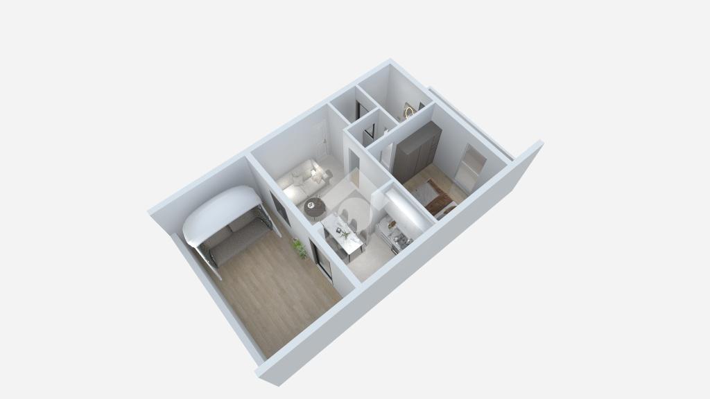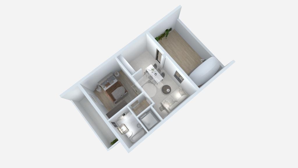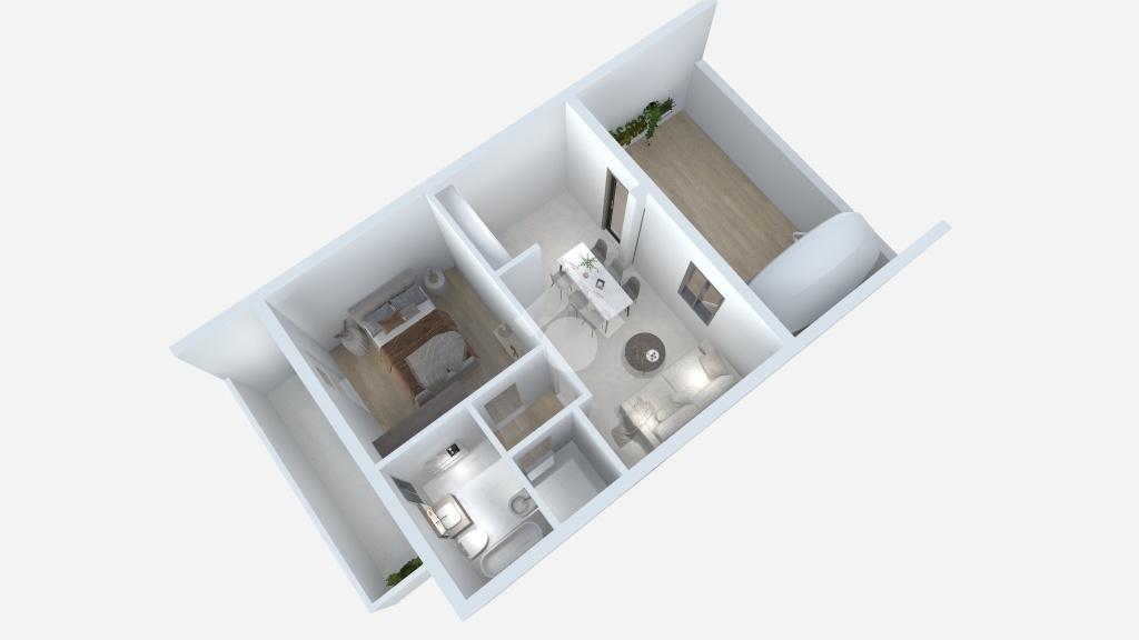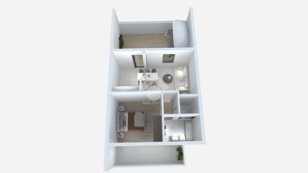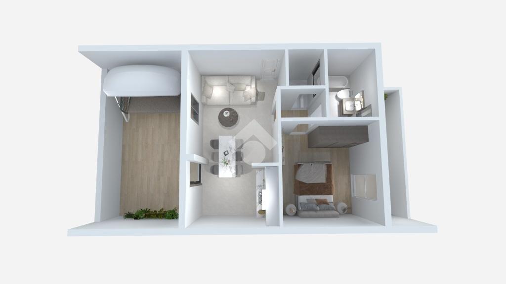 Posto a piano primo, l'appartamento di 52 mq è composto da soggiorno con angolo cottura e accesso all'ampio terrazzo, disimpegno, un ampio ripostiglio, una camera matrimoniale con accesso al balcone di 9 mq circa e un bagno finestrato con vasca.